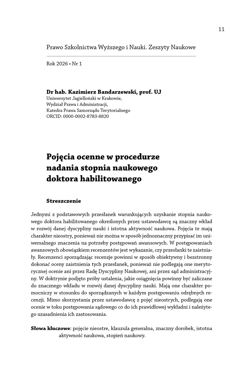 Jednymi z podstawowych przesłanek warunkujących uzyskanie stopnia naukowego doktora habilitowanego, określonymi przez ustawodawcę, są znaczny wkład w rozwój danej dyscypliny nauki i istotna aktywność naukowa. Pojęcia te mają charakter nieostry, ponieważ nie można w sposób jednoznaczny przypisać im uniwersalnego znaczenia na potrzeby postępowań awansowych. W postępowaniach awansowych obowiązkiem recenzentów jest wykazanie, czy przesłanki te zaistniały. Recenzenci sporządzając recenzje powinni w sposób obiektywny i bezstronny dokonać oceny zaistnienia tych przesłanek, ponieważ nie podlegają one merytorycznej ocenie ani przez Radę Dyscypliny Naukowej, ani przez sąd administracyjny. W doktrynie podjęto próby ustalenia, jakie osiągnięcia powinny być zaliczane do znacznego wkładu w rozwój danej dyscypliny nauki. Mają one charakter pomocniczy w stosunku do sporządzanych w każdym postępowaniu odrębnych recenzji. Mimo skorzystania przez ustawodawcę z pojęć nieostrych, podlegają one ocenie w toku postępowania sądowego co do ich prawidłowej wykładni i należytego uzasadnienia ich zastosowania.
